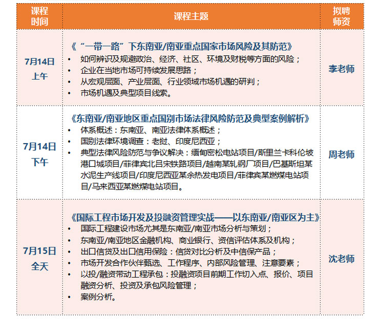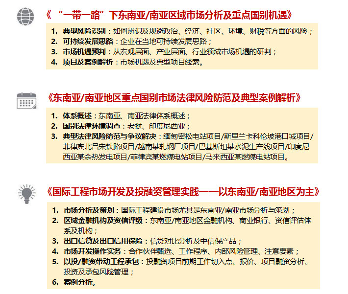 在”走出去”过程中,东南亚/南亚等区域市场是中国公司的重要目标市场之一。作为重点区域市场,这些地区在市场环境、社会人文、融资条件、投资潜力、法律体系、合同条款、执行标准等方面有着自身特点或要求,中国工程企业要想更好地开发及运营区域市场项目,系统地实战性学习显得尤为重要。