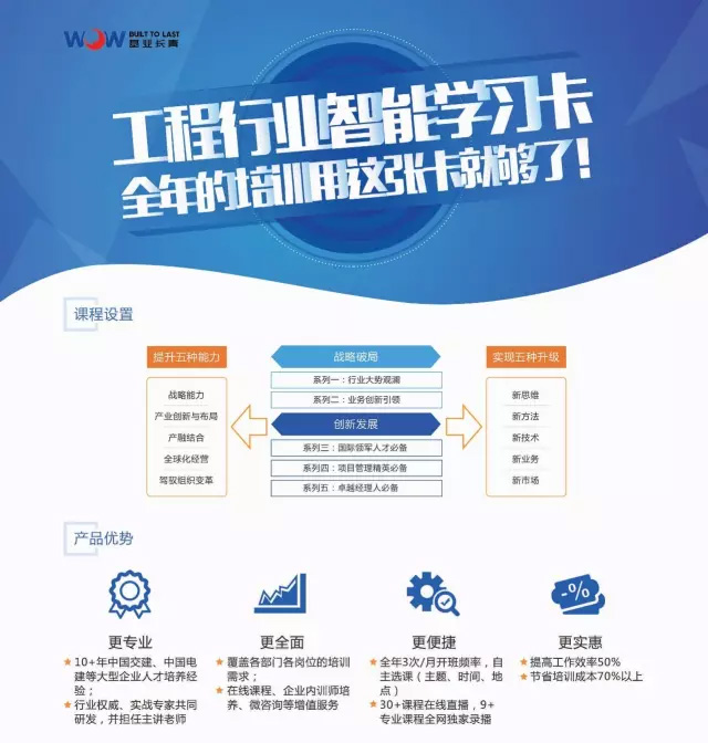 我们的产品和服务都是从工程企业面临的痛点难点出发,形成完整的针对行业的人才解决方案,包括国际工程项目经理定向特供培训计划、国际工程商务经理特训班、国际市场投资与建设PPP模式特训班、全球化领导力等培训项目,这是我们和别的培训机构很大的不同之处。