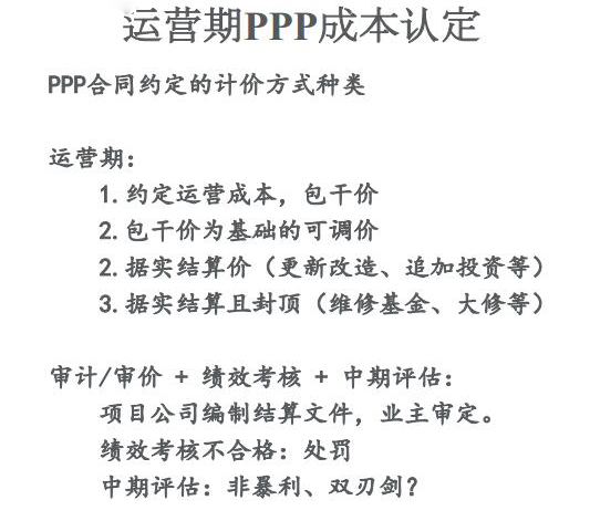 由于未来无法准确预测,PPP也遇到计价难题。①简单、 粗暴的计价方式—— 按年限、包死价。②天天扯皮的计价方式—— 使用者付费+可行性缺口补助。③装模作样的计价方式—— 预测未来成本及收益; 编写调价公式。④政府与社会资本之间的计价纠纷必然发生—— 绩效考核、 中期评估、 公众不满等不可知因素,将引起《PPP合同》 条件变更。