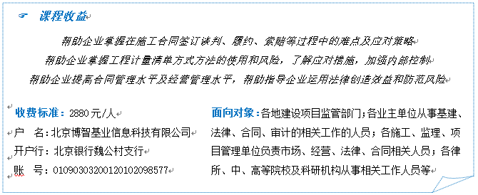 「名家联袂,师资阵容强大」本次培训采用行业知名专家联合授课形式,注重教学内容的实用性,探讨交流施工合同与计量清单控制的重点、难点、经验与教训,并引起学员共鸣;