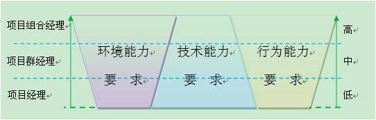 项目、项目群、项目组合,其管理内涵的不同导致了对不同层面项目经理的能力要求有所差异。在项目层面,项目经理应具备较高的技术能力——掌握项目管理技术与方法的能力,而在难度更大、效益更高的项目群或项目组合层面,则对项目经理的环境能力与行为能力具有更高的要求。从我们的经验来看,很多企业在培养、评估、选拔项目经理时对后者的界定和重视还不够,认为“技术能力强的就是好项目经理”,这与国际项目经理成长台阶、能力素质基准相比,显得过于简单了,不利于培养高低搭配、能力互补的国际项目管理梯队,从而壮大企业核心管理能力。参考下图: